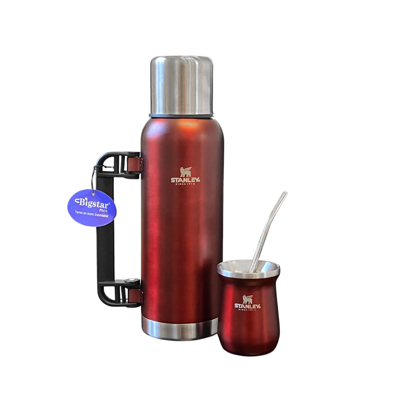 Combo Termo 1 Litro + Mate + Bombilla Simil Stanley Rojo Metalizado