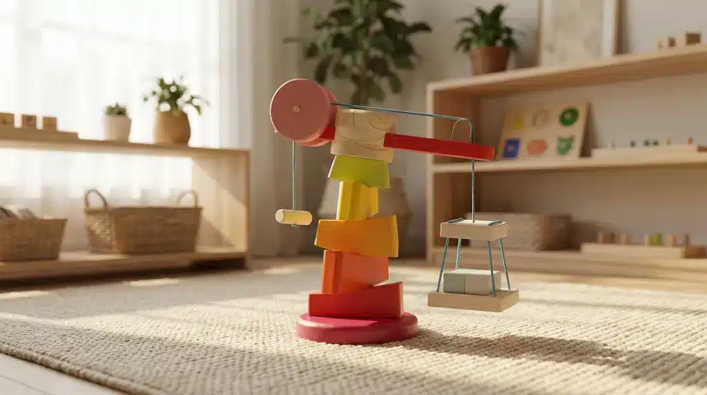La Grúa Clásica Manick es un juguete didáctico de madera diseñado para el juego de construcción, la exploración y el desarrollo de habilidades motrices y cognitivas.