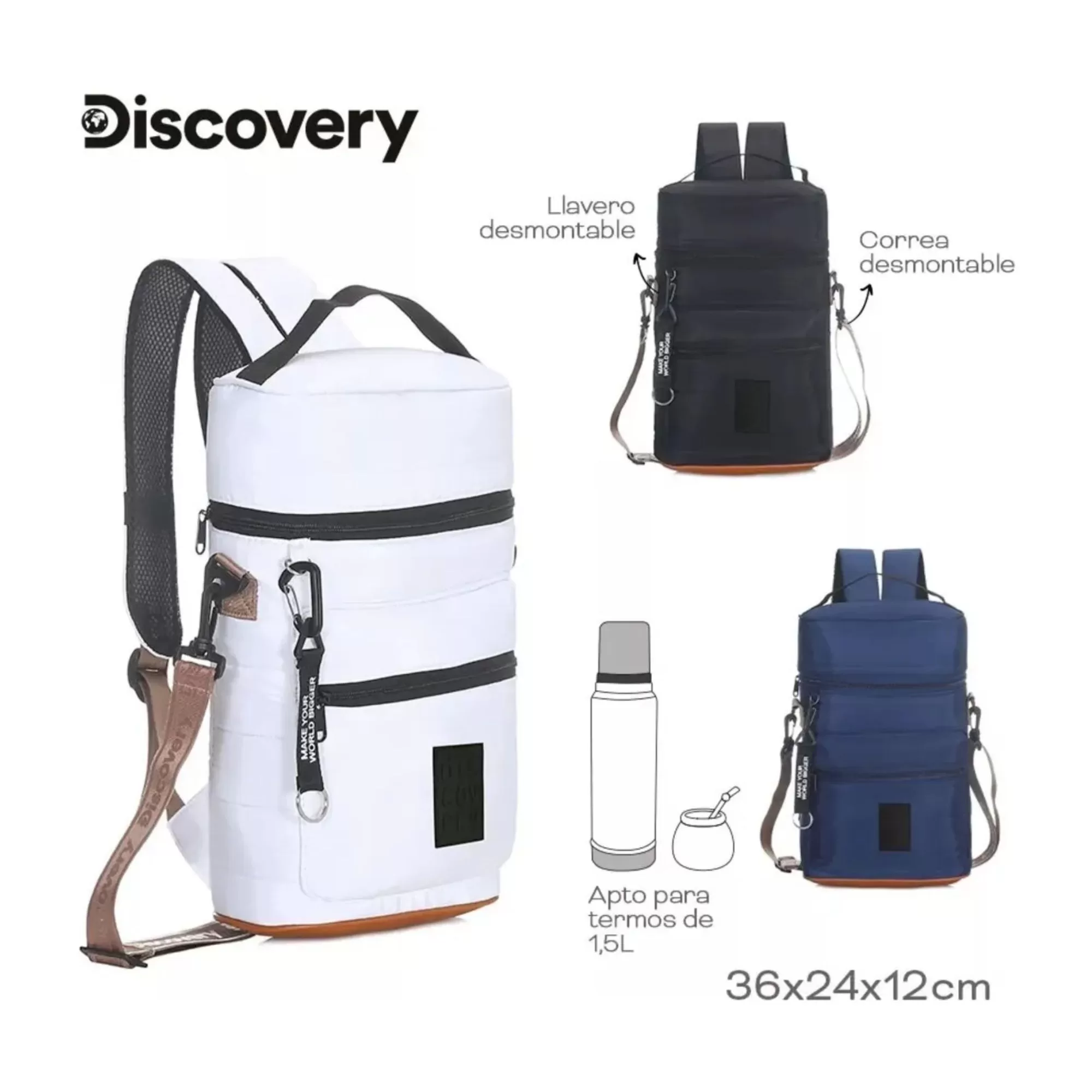 Mochila bolso matero 2 en 1 Discovery Adventures con llavero incluido. Con correa desmontable, bolsillo frontal y base de eco cuero. Ideal para llevar tu set matero con estilo y comodidad.